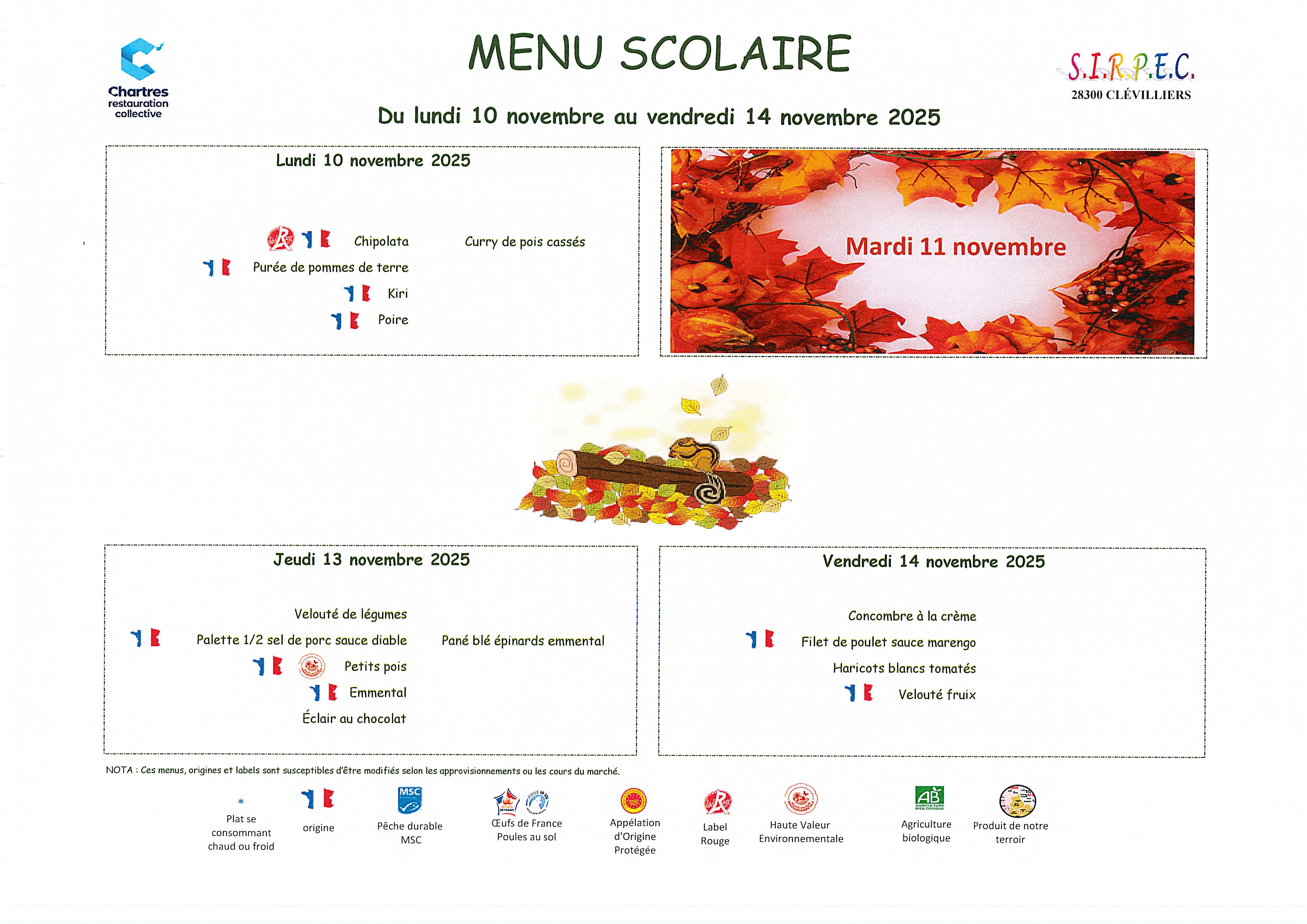 Semaine du 24 au 30 nombre 2025 - Inscriptions et renseignements auprès de la Mairie de Clévilliers : 02 37 23 96 22